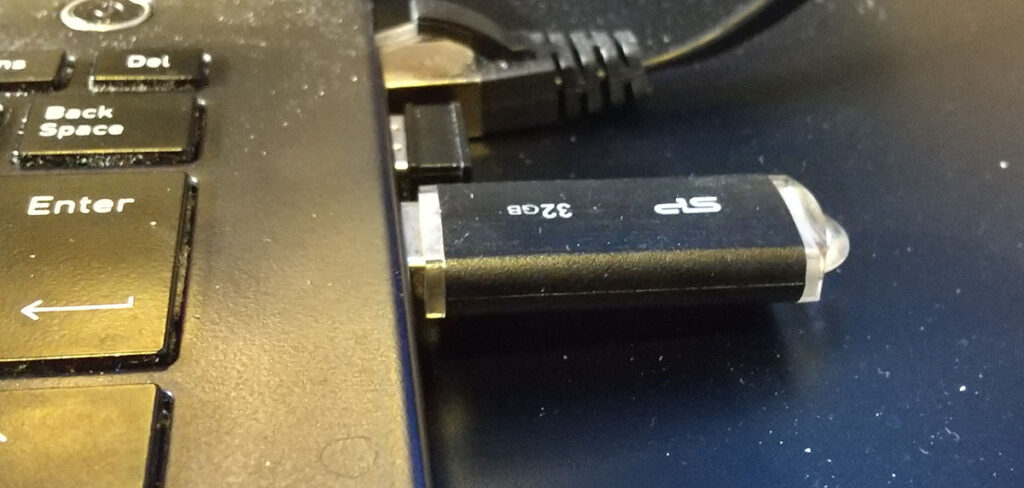 これはノートパソコンにUSBメモリを差し込んで使っている例ですが、これは右に差し込んだ例ですが、パソコンを持ち上げようとして、左側から持ち上げてテコみたいに右側のUSBメモリを曲げてしまう事例です。この様にして曲げたり折ってしまう例が非常に多いです。あとは足元においたデスクトップの全面に差し込んで折ってしまう事も多かったります。